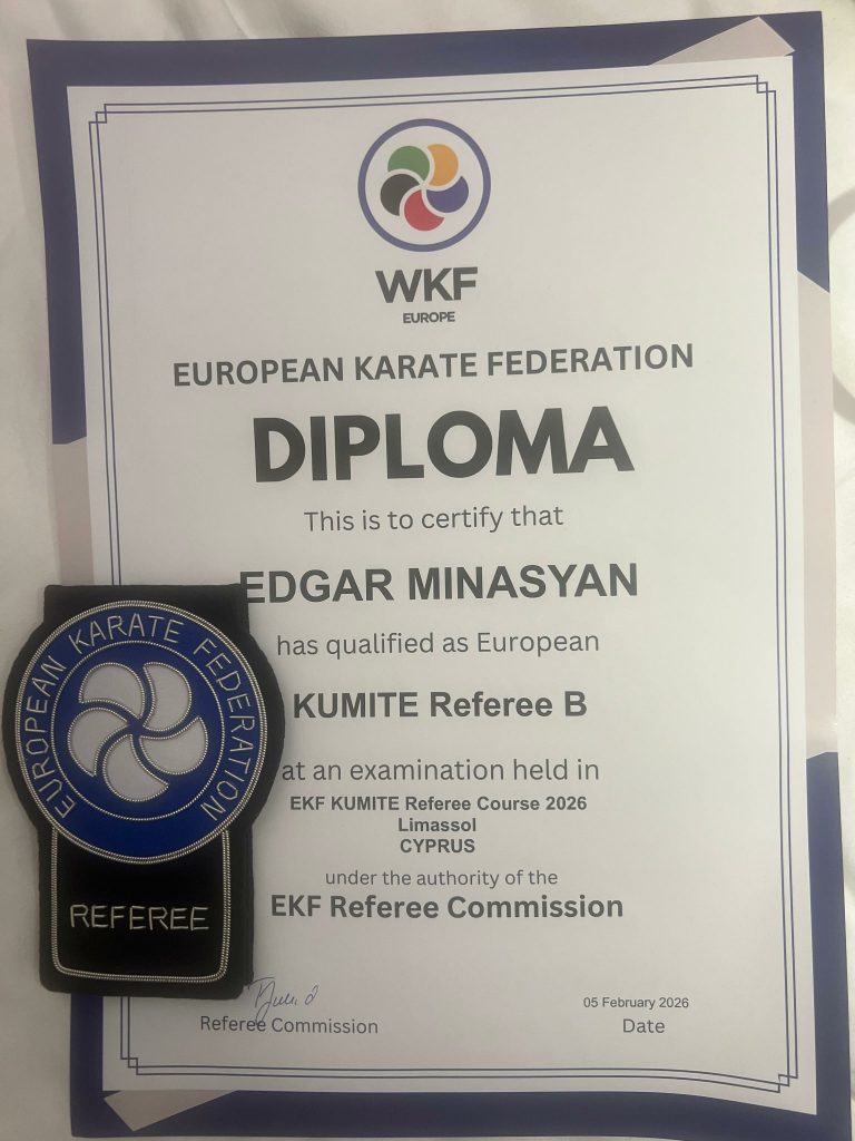 Ուրախությամբ տեղեկացնում ենք, որ Հայաստանի կարատեի ազգային ֆեդերացիայի մրցավար, միջազգային կարգի մրցավար Էդգար Մինասյանը Եվրոպայի Մ21 առաջնությանն ընդառաջ բարեհաջող հանձնելով մրցավարական որակավորման քննությունը՝ ստացել է EKF Referee B միջազգային որակավորում։